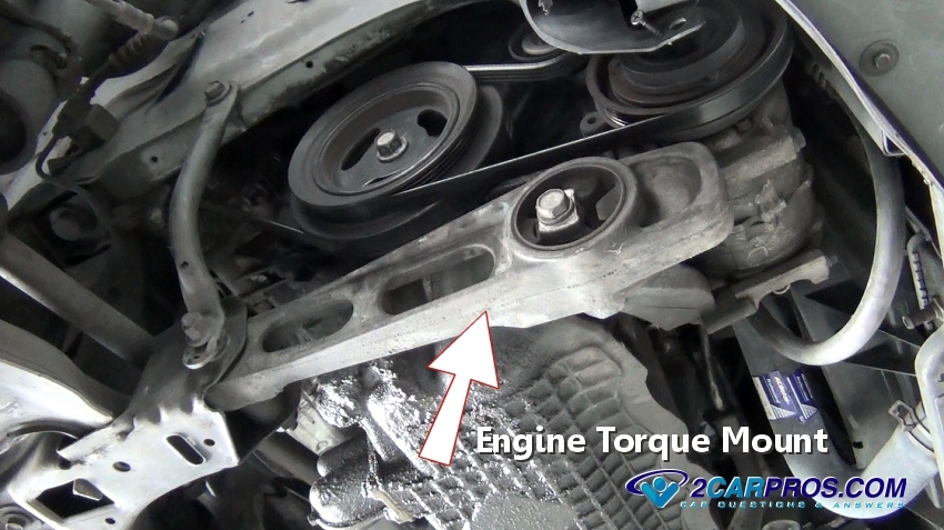 Using a flashlight identify the engine mount to be replaced. In the image below we show a torque style of engine mount which have a high failure rate due to excessive engine movement under load. You can see the right side bushing is worn allowing the engine to have excessive lateral movement.