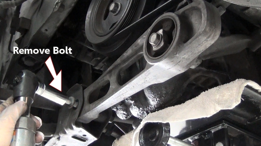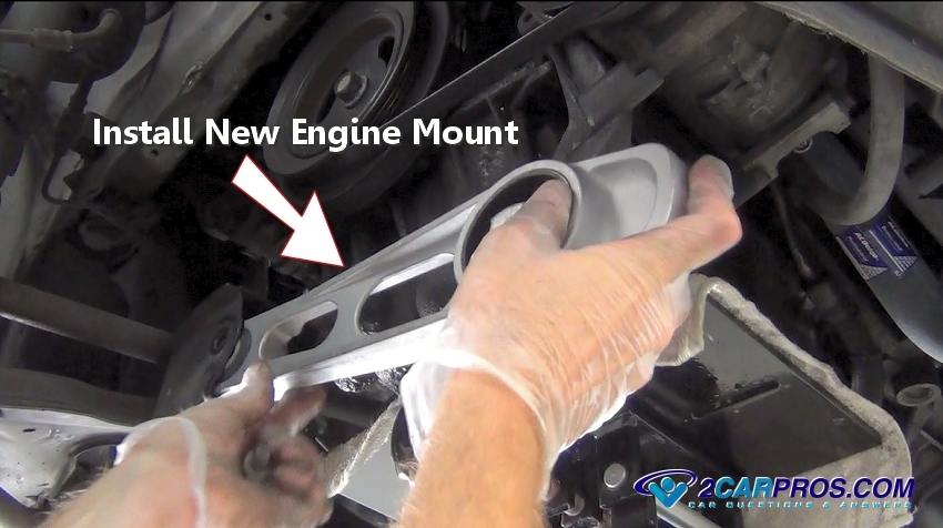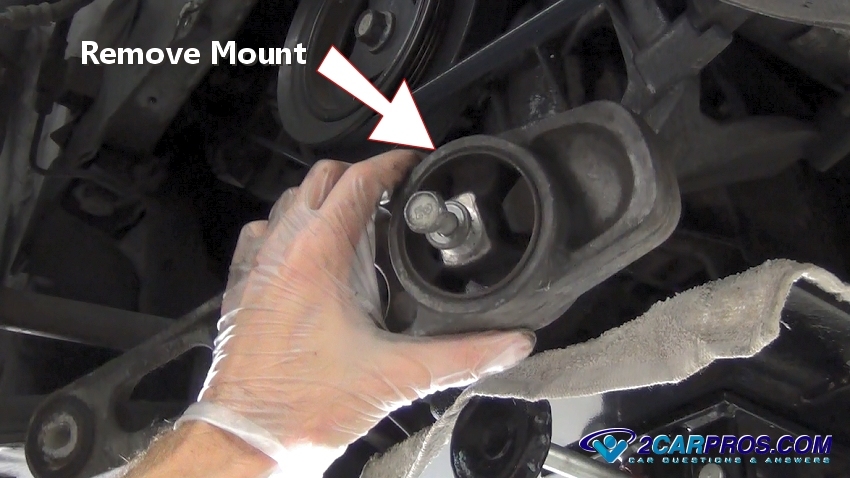 After all mounting bolts have been removed grasp the mount and pull it from the engine and frame brackets.