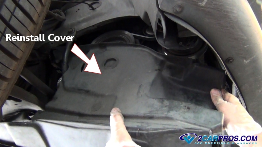 Reinstall cover bolts and tighten. Then lower the car off of the jack stands and you rare all set. When starting and driving the vehicle listen for any strange noises which could be a sign of a problem and will need to be checked out.