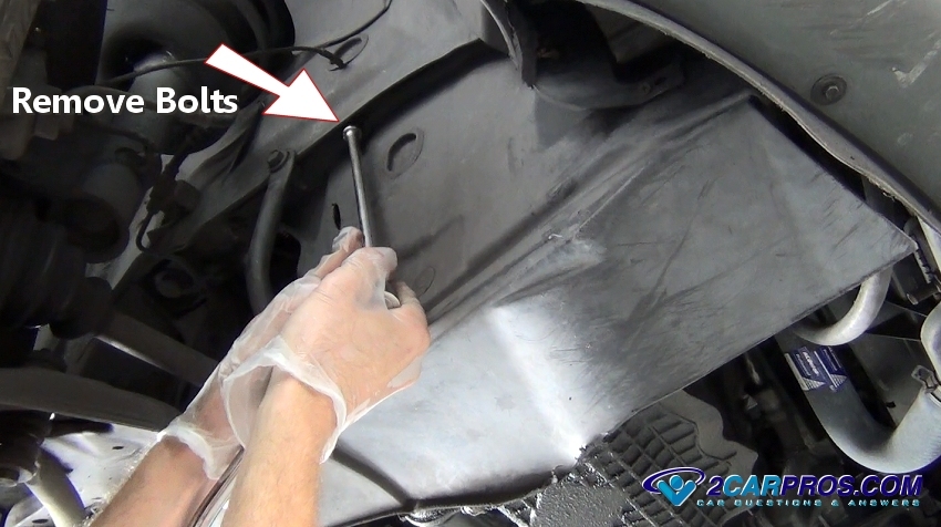 To clear access to the engine mounts locate and remove the lower cover bolts and the plastic engine covers. Put the bolts in a container so they don't get lost during the job.
