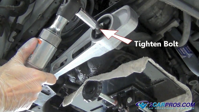 Using a ratchet or wrench tighten both the mounting bolt and nut to manufacturers recommended tightness which is usually between 45 and 55 foot pounds of torque.