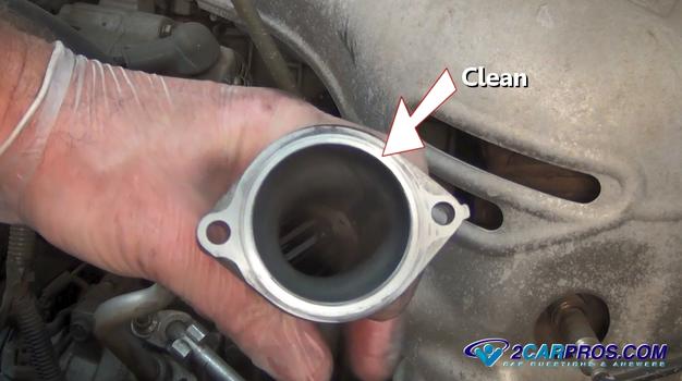 Before reinstalling the thermostat housing, clean the sealing surface using a
