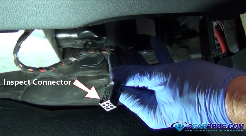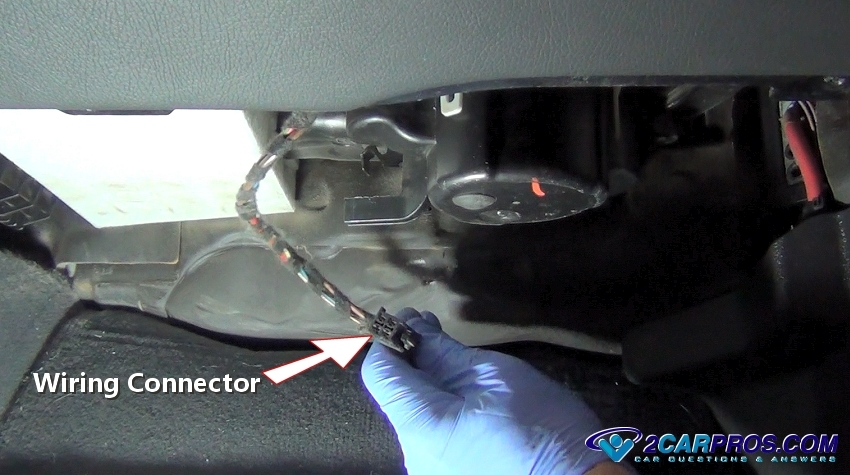 4. Locate and disconnect the HVAC system blower motor wiring by releasing the safety tab on the side of the connector. This connector can have one or four wires depending if the system is manually or automatically controlled. These different systems will vary the fan speed by using a solid state speed controller apposed to a basic speed resistor.