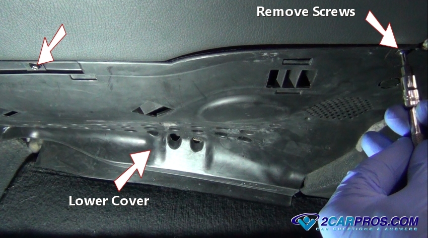 2. If you cannot find the blower motor under the hood it will be located under the dash on the passenger side. You may need to remove the mounting screws of the lower trim panel to gain access to the motor for removal.