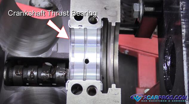 The crankshaft thrust bearing is used to retain the crankshaft in the center of the engine block while rotating. When this bearing degrades excessive clearance is obtained and the crankshaft will "wonder" back and forth inside the engine block while producing a knocking noise. This sound will not be as prominent as the aforementioned failures.