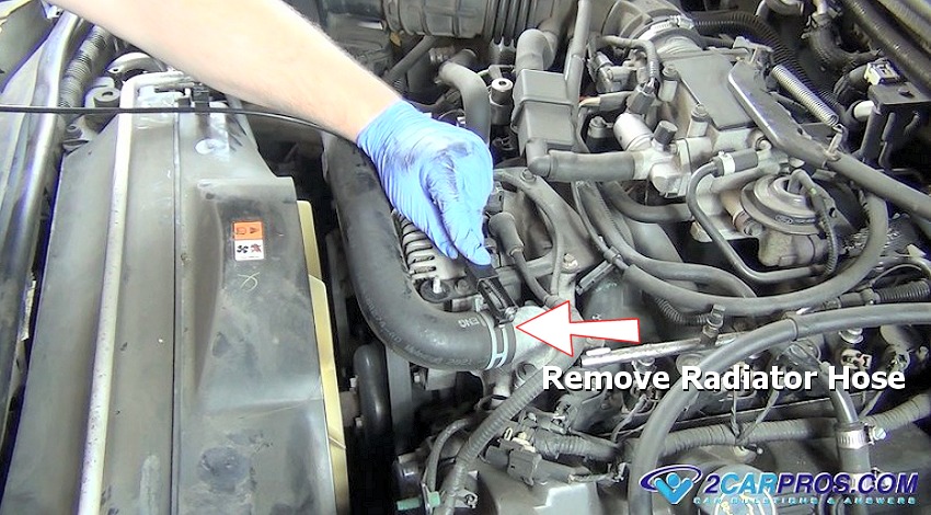 or timing cover. Use a fluid catch basin, and open the radiator drain valve or remove