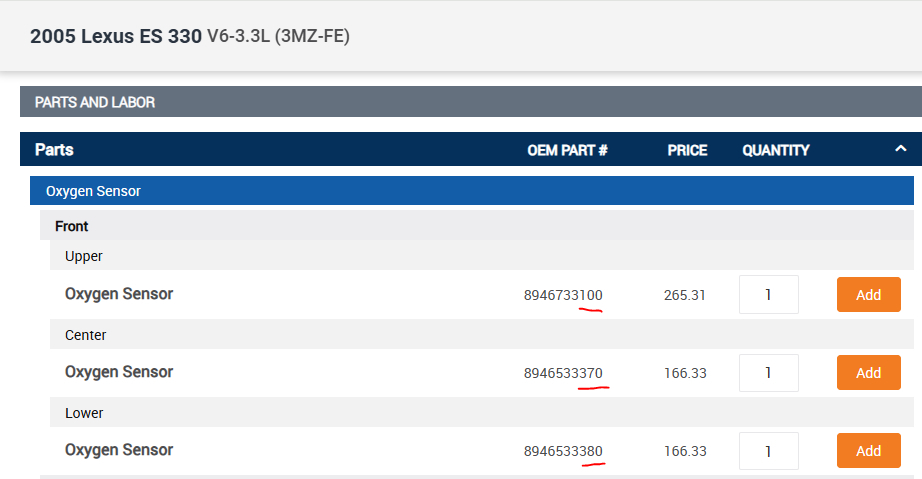 That should have two upper wide band sensors and the lowers are "standard" O2 sensors. The normal thing for Toyota and Lexus is to call them an air fuel ratio sensor when they are the wideband versions and heated oxygen sensors when they are the common ones. The problem is that many parts places just call them all O2 sensors. All 4 positions use different sensor part numbers. However like many imports they might be the same sensor but with a different color connector or different length harness which gives them a different part number, even though the part is the same and the changes really don't matter. I've used NTK on Lexus before and they reported correctly, avoid the really off brands though, Like many imports Toyota-Lexus can be very finnicky when it comes to parts. I prefer OE if at all possible.