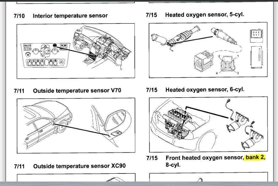Bank 1 is going to be the bank at the front of the vehicle. O2 sensor 2 is going to downstream or the O2 sensor after the catalytic converter, closest to the muffler. I have included in the diagrams down below a diagram of the o2 sensors for a 5 cylinder and a v6. The O2 sensor for the V6 is for bank 2 so bank 1 would be the opposite. Please get back to us with what turns out.