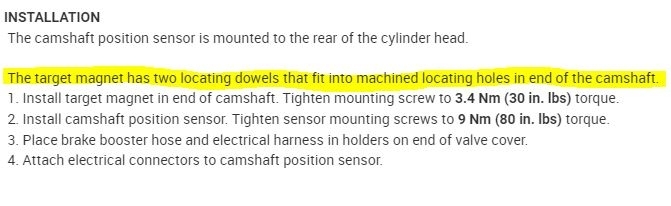 The target magnet has two locating dowels that fit into machined locating holes in end of the camshaft.