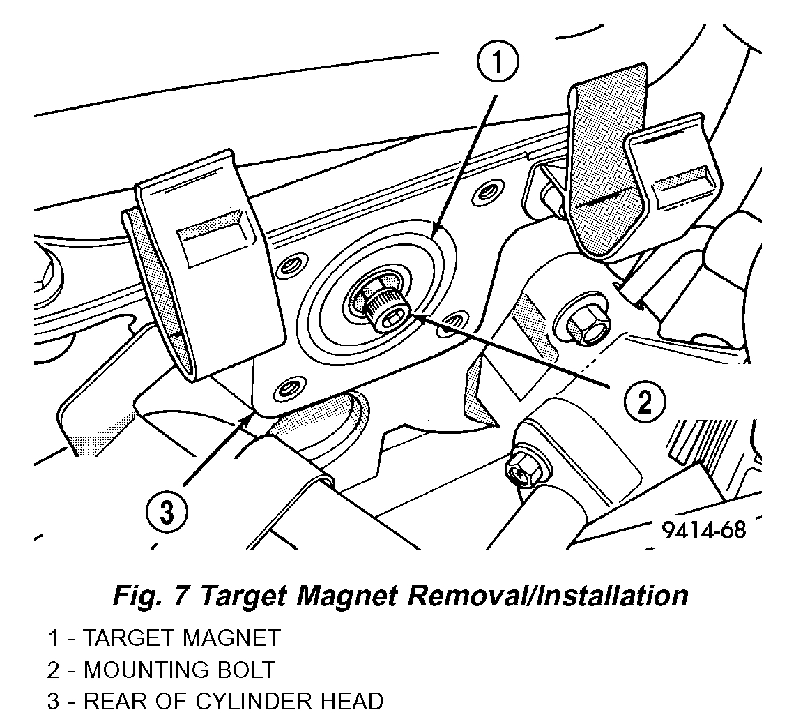 Install target magnet in end of camshaft. Tighten mounting screw to 3.4 Nm (30 in. lbs.) torque. Over torquing could cause cracks in magnet. If magnet cracks replace it.