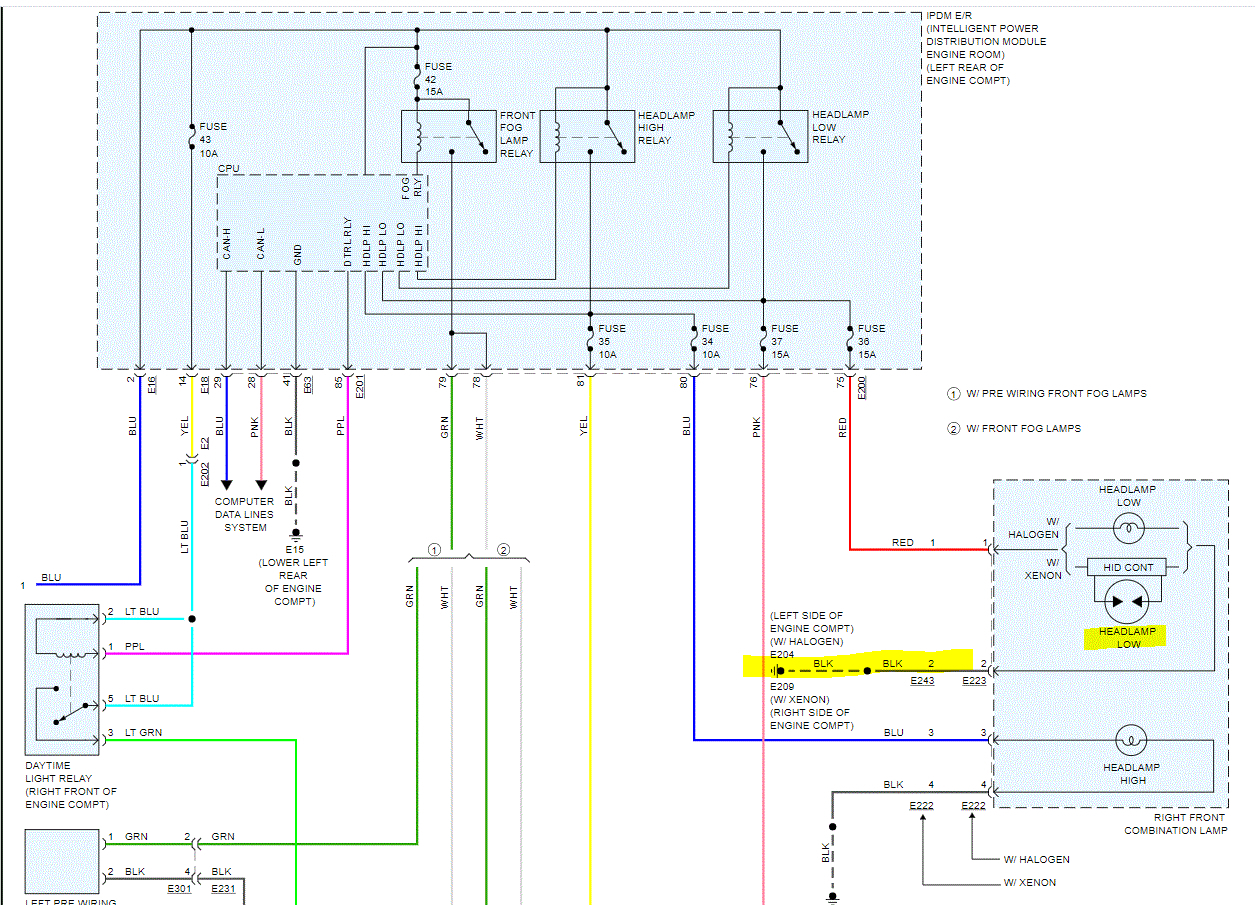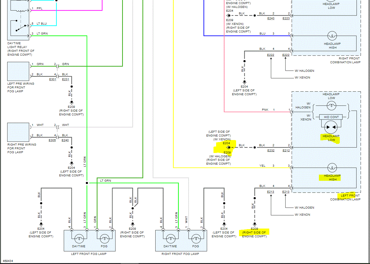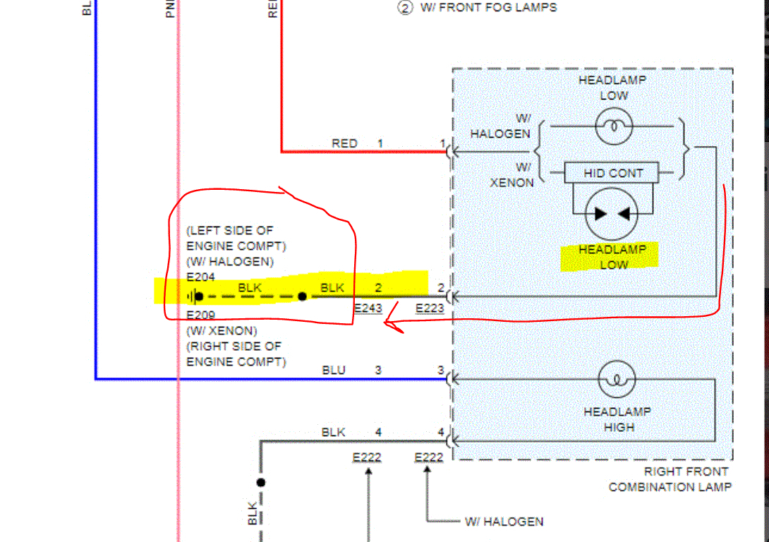 If you look at the attached pics below, I included the entire wiring schematic related to the headlamps. I highlighted 4 wires. Note: Each wire is for ground to a different bulb and different beams (high or low). If you are comfortable doing it, go to the light on the schematic showing the problem light. I highlighted where the ground location is located. Locate and inspect the ground as well. Make sure there isn't corrosion, damage to a wire, and make sure it is tight.