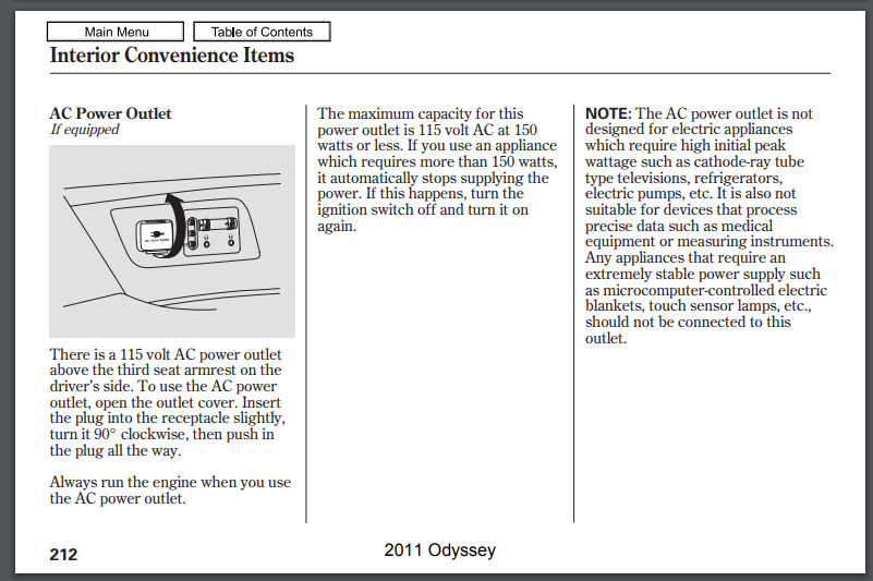 This van has a few "lighter" style outlets, but it also has one 2-prong "house" style outlet in the third-row seating area. The label states it is 115V and 150W. And there is also a composite AV connector right next to the outlet for use with the fold down DVD player screen, making me think they intended for you to plug in a video game console or similar to that power outlet. But I can't think of any video game console that only uses 1.3A, unless they are thinking of something old-school.