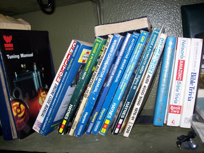 Mr. Jeeps ('77 CJ5) personal manual is the Top row, faded and sorta falling apart Chilton 3rd over---4th over, stays in "WILLY", ('46 Willys Jeep, my Avatar)----top row 1st, manual is one that was in a Jeep I bought in 1984, its a "1979 AMC JEEP SERVICE MANUAL" as you can see, I failed to care for it...I Just about cry when I need it now (its really the BEST MANUAL I OWN, and the EZist to understand) I can be seen trying to "iron" some it out so I can read vacuum diagrams