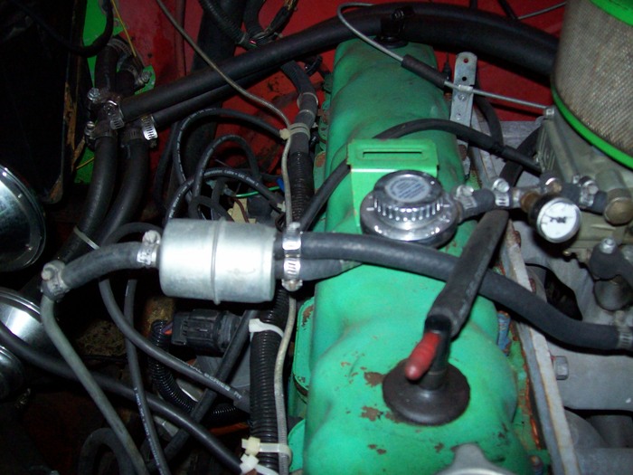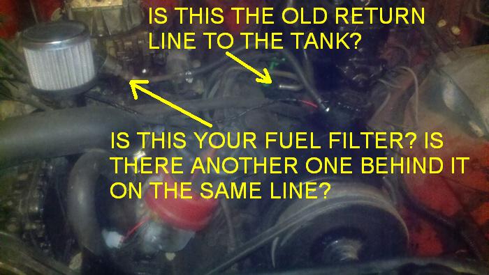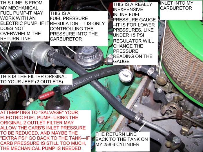 WITH THE FUEL LINE SET UP, AS IN MY PICS, ONE END COMES FROM THE MECHANICAL FUEL PUMP, GOES INTO THE FILTER, SPLITS OFF TO THE CARB, AND THE "HIGHER", SMALLER LINE ON THE FILTER, GOES INTO THE RETURN, AND BACK TO THE TANK....THIS PREVENTS OVER-PRESSURING THE NEEDLE AND SEAT INSIDE THE CARB.....MY PUMP PUTS OUT LESS THAN 7 PSI!!! AND STILL, IT IS SET UP THIS WAY.