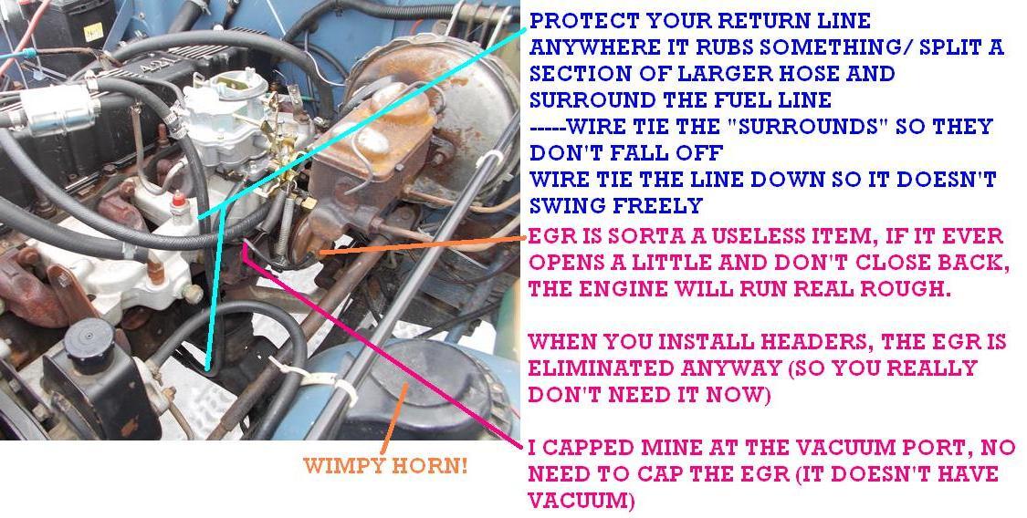 SINCE THEN I HAVE ADDED A HOLLEY 390 CARB AND A OFFENHAUSER 4 BARREL INTAKE TO MY 258. (18 MPGs KICKING AROUND/ POWER IF I GET ON IT!) THAT ELIMINATED THE BOWL VENT FILTER.