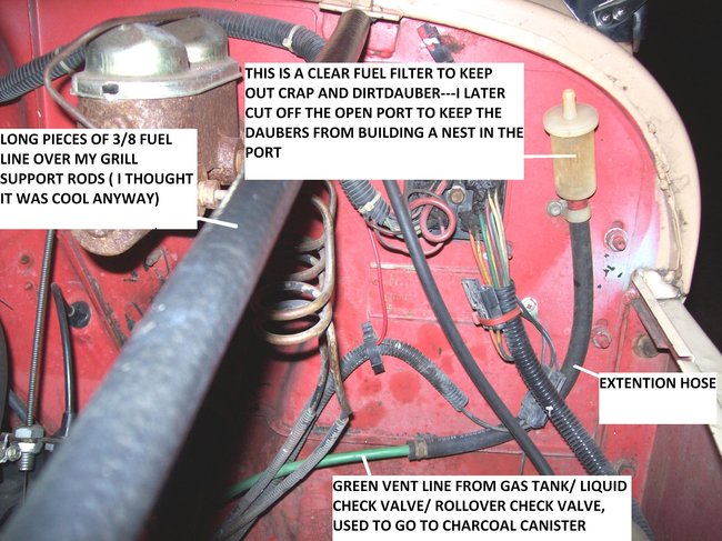 IF YOU HAVE A CARTER BBD, I SIMPLY ADDED ANOTHER FUEL FILTER JUST BELOW THE "TEE" IN THE BOWL VENT LINES. HENCE I HAD 2 BREATHING FILTERS, ELIMINATED A FEW LINES AND MY CRUMBLING CANISTER.
