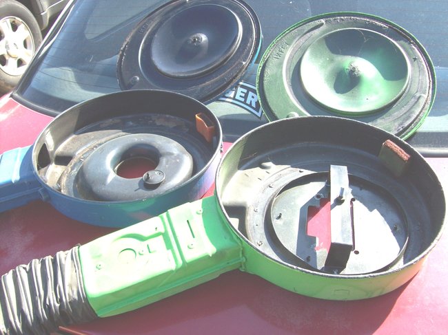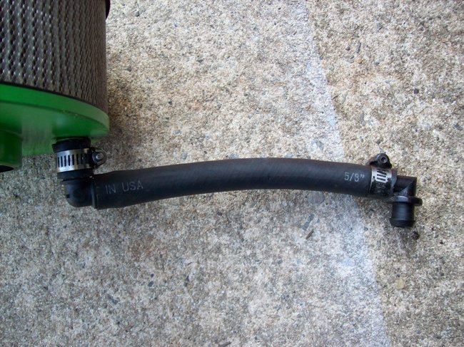 A DIRT DAUBER CAN/ MAY HAVE ALREADY BUILT A MUD NEST IN THE OPEN END OF THE HOSE. (CHECK FOR THAT), AS IT IS BLOCKING AIR FROM EVENTUALLY GETTING TO THE CARB. THEN LET'S ATTACH THE HOSE THRU THE AIR CLEANER FOR FILTERED FRESH AIR.