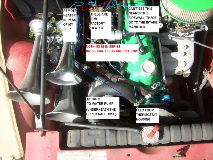 I HAVE A '77 CJ 5---I HAVE MANY MODIFICATIONS ON THE HEATER LINES, I LEARNED I MUST INSTALL "FIXTURES" AS IF IT WERE A "STEAM" SYSTEM..."FEED AND RETURN"....THINGS DO NOT WORK IN A SERIES