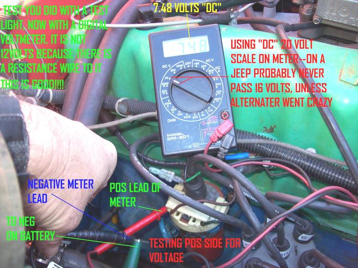 I'LL LET YOU INVESTIGATE THIS ONE! GO TO YOU TUBE, SEARCH "HOW TO" USE A VOLTMETER/ TEST RESISTANCE/ TEST CONTINUITY......I'M SORTA KNOWN FOR "I'LL HELP YOU, HELP YOURSELF"......I FIND THAT YOU PICK THINGS UP FASTER IF IT'S NOT JUST HANDED TO YOU!