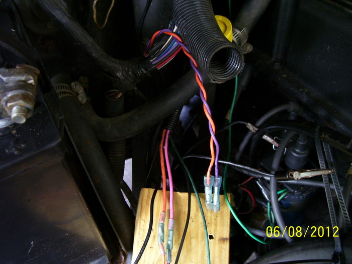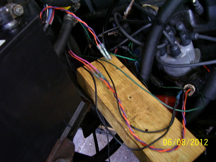 Photo 3. Wires going to the dist. Blk, org, purple. There are two blk wires leading from the single blk wire at the connector. One of these blks goes to grd. on the firewall, the other to the ign module (i assume, I could not follow it throught the harness). The orange wire from the connector goes to the orange wire butt splice, and to the ign module. The purple from the connector goes to the pink wire butt splice and to the ign module. Per the carb. install instructions. looks like this was done to bypasses the MCU, what do you think?