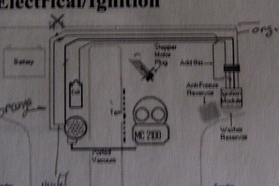 Heres a pic of the tricked diagram. This is the best I could get with my camera, and Kodak enhance. Originally the orange and purple wires from the dist. went into the harness and through the firewall. Now they go to the Ign. mod. orange to orange and purple to "added pink wire" spliced to the purple wire at the Ign mod.