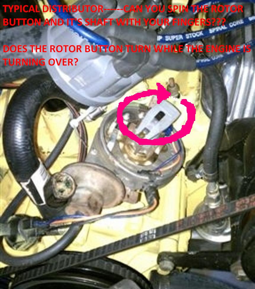 BEING "STERN", BUT NOT TOO FORCEFUL (DON'T BREAK THE ROTOR BUTTON!) SEE IF IT WILL TURN WITH YOUR FINGERS...BUTTON ALONE OR BUTTON AND SHAFT TOO.....IF IT DOES THE BUTTON MAY BE BROKE, IF THE SHAFT TURNS ALSO, THE GEAR ON THE BOTTOM OF THE SHAFT MAY HAVE SHEARED THE ROLL PIN WHICH HOLDS IT IN PLACE