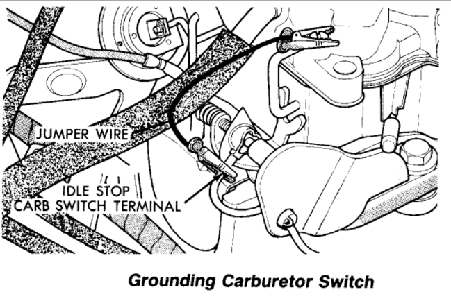(6) On vehicles equipped with a carburetor switch, connect a jumper wire between carburetor switch and ground. On vehicles not equipped with an SCC, disconnect and plug vacuum line at distributor.