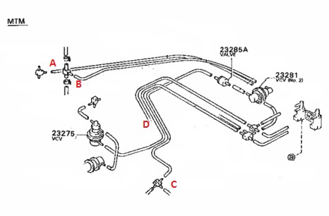 Where these hoses lead is not clear from the diagram. They seem to be emisison related. D seems to be joined to the EGR valve. As to A, B and C, dose it go to any components nearby?