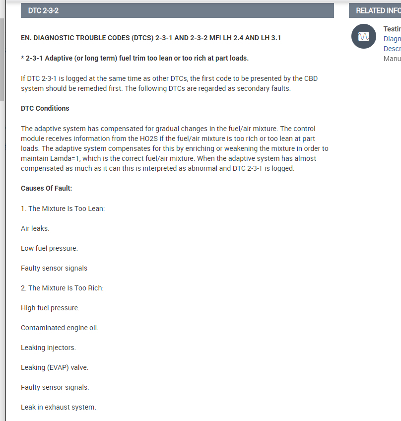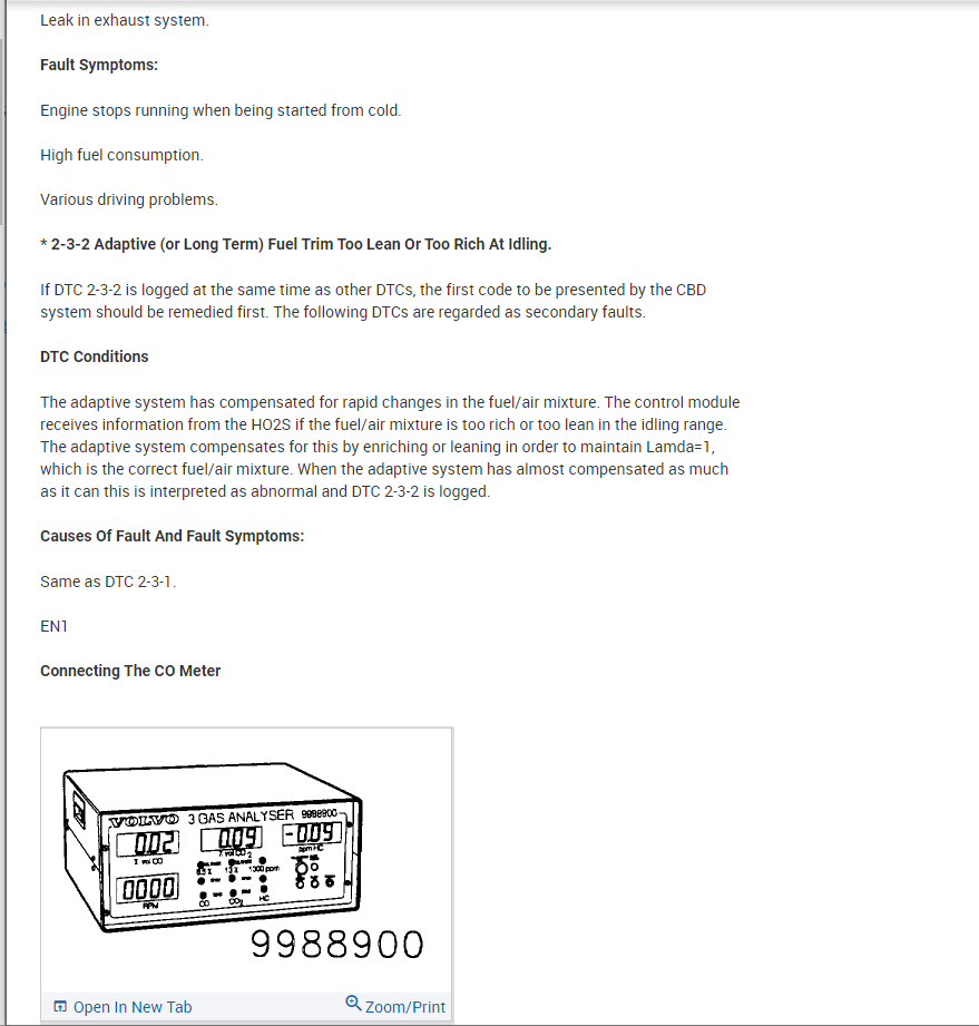 my 89 Volvo 240 GLT keeps giving error code 2-3-2, "fuel system compensating for rich or lean mixture at idle," according to the manual. The idling is affected, sometimes up to 1500 RPM. What are the possible causes of this problem, and how may they be fixed? It's a B 230F EFI engine. Any leads would be appreciated. Thanks!