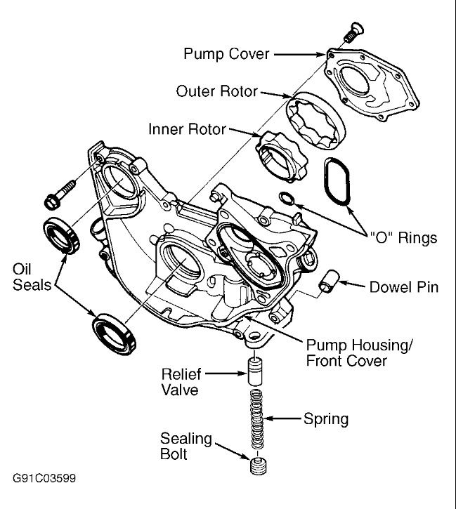 raise vehicle, drain oil align Number 1 cyl at TDC remove timing belts remove pan and pick up screen. remove cover/pump assembly. remove pump from cover and seals. reverse for re assembly.