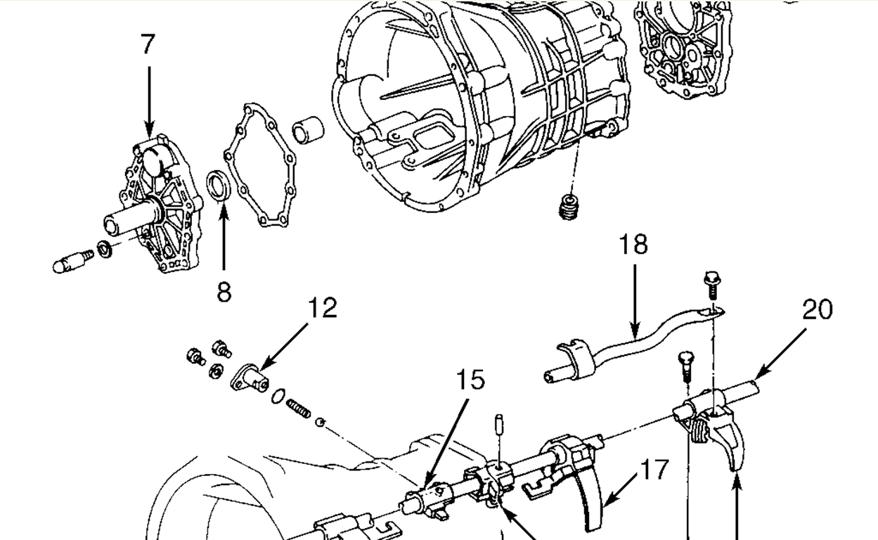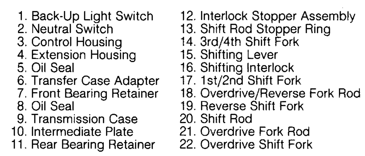 shift rod, lever and interlock. Remove 1st/2nd, 3rd/4th and reverse shift forks. Remove