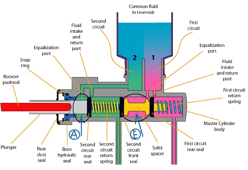 At the image of the dual master cylinder that i attached,it looks like that the brake fluid in the circle parts,which i marked as A and E,will not flow out.