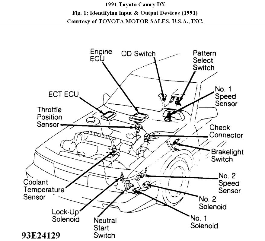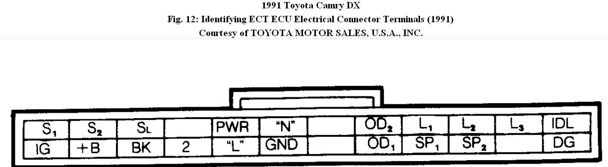 9. Check for battery voltage between terminals "L" and GND on ECT ECU with connector installed on ECT ECU and shift lever in "D" position. See Fig. 12 . If battery voltage exists, check for defective neutral start switch or wiring circuit. If battery voltage does not exist, replace ECT ECU.