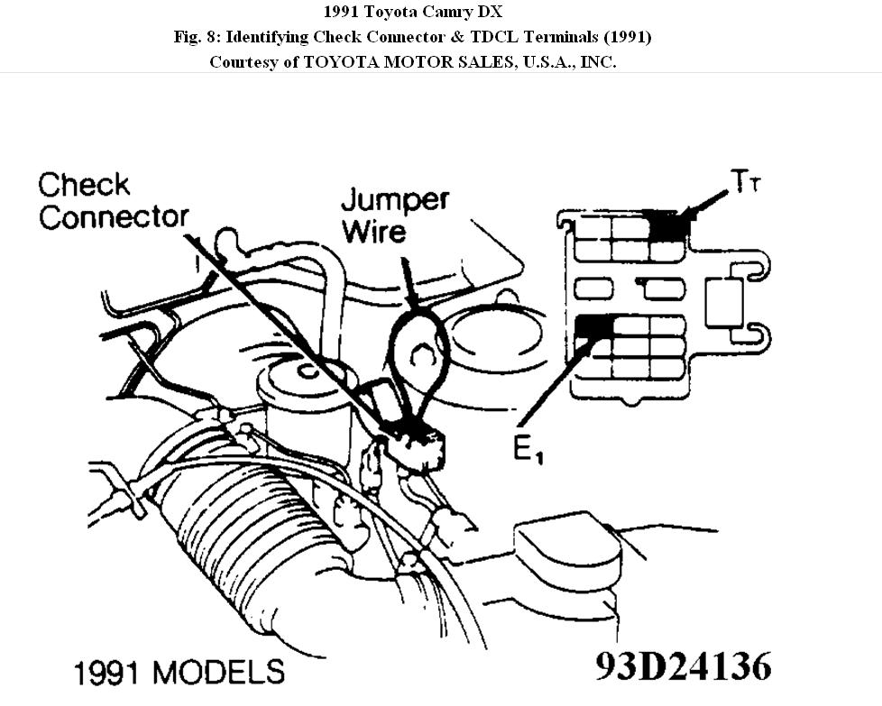 1. Warm engine to normal operating temperature. Connect voltmeter between terminals TT and E1 of check connector. Check connector is located in engine compartment, near left strut tower. See Fig. 8 .