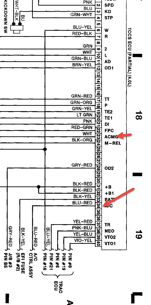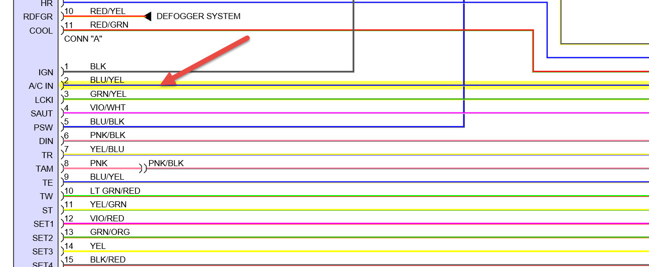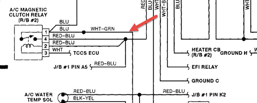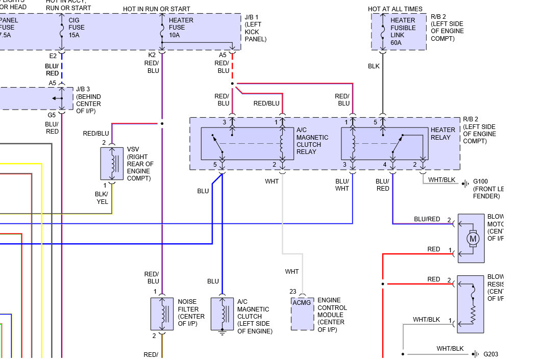 Sorry for any inconvenience. Sometimes the pin numbers are different on your schematic and mine. So, I will speak in terms of the wire colors. On my schematic, the Magnetic Clutch Relay is fed by the Red/Blue wire off of the 10A Heater circuit. For this relay the Red/Blue wire feeds both the relay coil and the internal switch which ultimately feeds the Magnetic Clutch coil (with a Blue wire) and the A/CIN pin on the dash mounted A/C control unit with a White/Green wire . Adjacent to the Magnetic Clutch relay is the Heater relay wherein the Red/Blue wire only feeds the relay's coil which engages the internal relay switch that connects the 60A Heater circuit to both the blower and a White/Black wire that attaches to a (EB) ground (front side of left fender). To see if energizing the White/Green wire that ultimately attaches to the A/CIN pin on the A/C control unit (D connector #2 pin), I shorted the positions #3 & #5 on the Magnetic Clutch relay but, nothing happened. When I checked further, the Red/Blue wire wasn't providing any power. I then attached a lead directly from the positive side of the battery but, still nothing. I couldn't immediately find the 10A Heater circuit fuse. I thought it might be in the left kick panel but, the manual does not show any 10A HTG in the picture but, shows a 10A HTR within the Schematic. There are two 10A in the picture one labeled MIR-MTB & the other MTB. Significant? I will check them out although since I provided direct power to the White/Green wire with no change, it doesn't seem that's the answer although it may be part of the answer. If it is possible to determine all of the leads which bring power (plus all grounds) to the A/C controller when it is operational, I could adjust the wiring accordingly and see if that resolves the issue. Somehow we are either not feeding the unit with the power it needs or we are missing a ground. As noted earlier, when I originally tested the 3 A/C control connectors, I only found 2 power sources (connector A12 pin #1 (+B) & 15 (ACC)) and 2 grounds (Connector A12 pin 7 (GND) and connector A14 pin 5 (LP). Any thoughts? Thanks for your help.