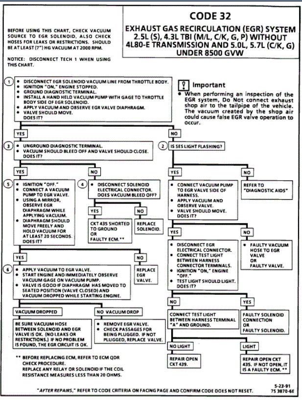 The ECM monitors EGR effectiveness by de-energizing the EGR control solenoid, thereby, shutting "OFF" vacuum to the EGR valve diaphragm. With the EGR valve closed, and 02 sensor fluctuating normally, fuel integrator counts will be greater than they were during normal EGR operation. If the change is not within the calibrated window, a Code 32 will be set.