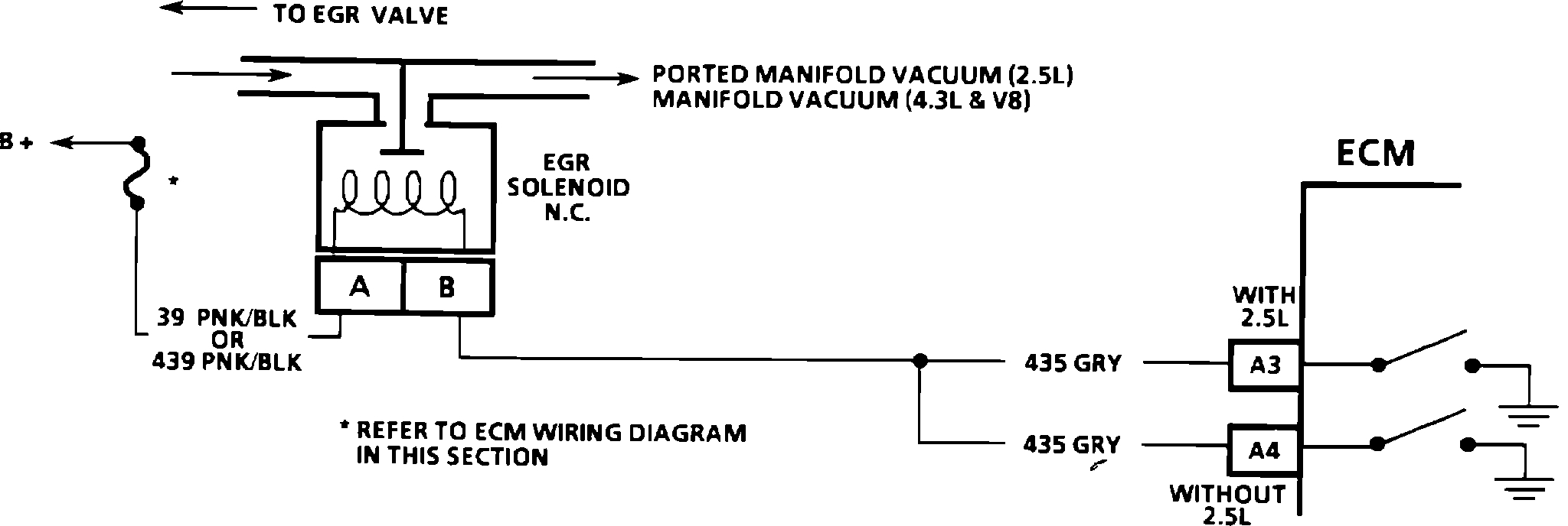 The ECM operates a solenoid to control the exhaust gas recirculation (EGR) valve. This solenoid is normally closed. By providing a ground path, the ECM energizes the solenoid which then allows vacuum to pass to the EGR valve.
