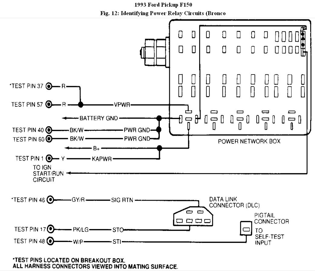 Use only a VOM or DVOM for this step. DO NOT use scan tester. Turn ignition off. Disconnect cruise control servo (if equipped). With DVOM on 20-volt scale, connect DVOM negative lead to STO terminal at Data Link Connector (DLC). Connect positive lead to positive battery terminal. Using jumper wire, connect STI to SIG RTN at DLC. See Fig. 12 and Fig. 13. Perform KOEO SELF-TEST until continuous memory test is complete. DVOM will read less than one volt when test is complete. Depress and release throttle. If voltage increases, OUTPUT STATE CHECK has been entered. Go to step 5). If voltage does not increase, depress throttle to WOT and release. If STO voltage does not increase, go to CIRCUIT TEST QC.