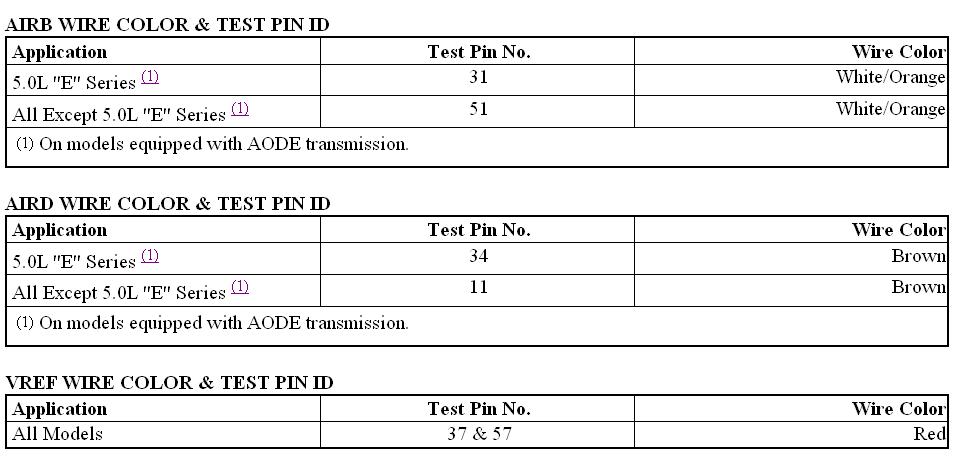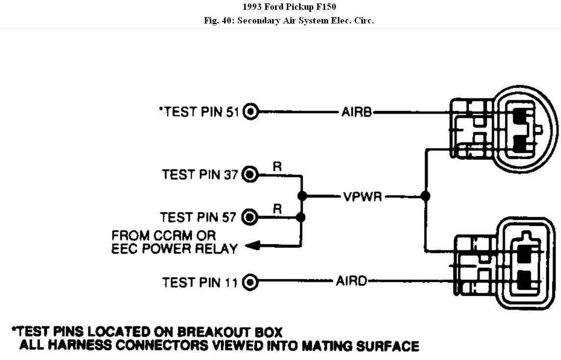 Leave ignition off. Disconnect PCM 60-pin connector. Inspect terminals, and repair if damaged. Install EEC-IV Breakout Box (T83L-50-EEC-IV), leaving PCM disconnected. Measure resistance between AIRB test pin and AIRB terminal at wiring harness connector. Measure resistance between AIRD test pin and AIRD terminal at wiring harness connector. If either reading is 5 ohms or more, repair open circuit and repeat QUICK TEST. If both readings are less than 5 ohms, go to step 11).