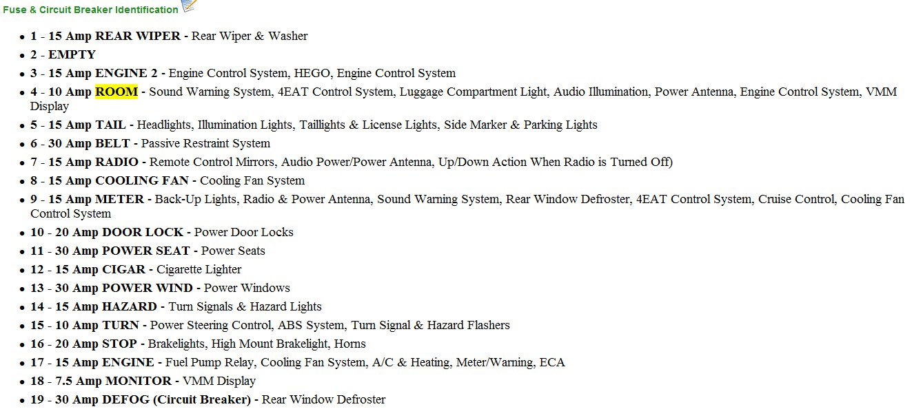 There is a drain on the battery that causes the battery to discharge in a few days. Then the car cannot be started without a jump start. What is causing the load in the circuit protected by the fuse labeled 'ROOM' ?