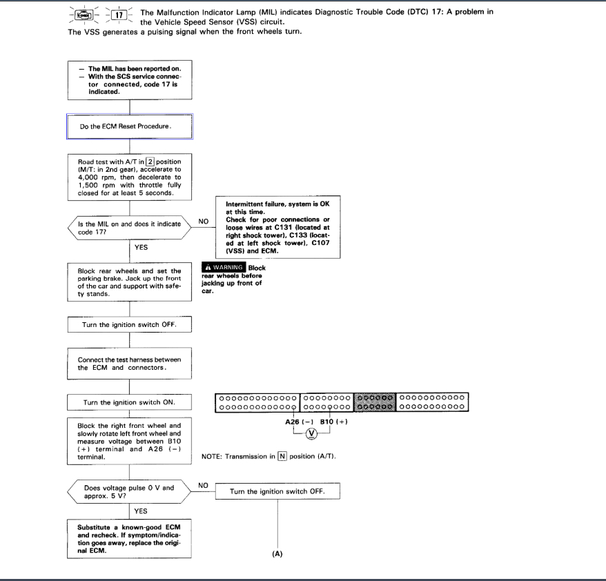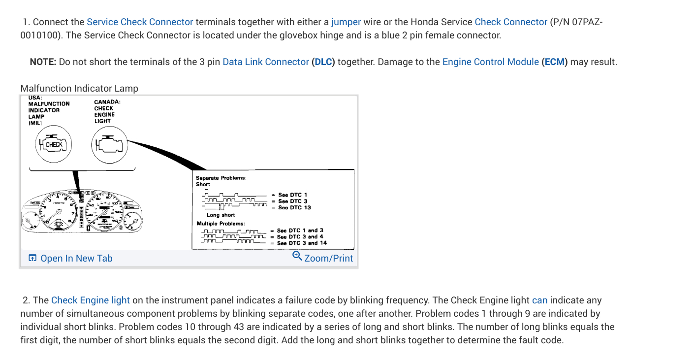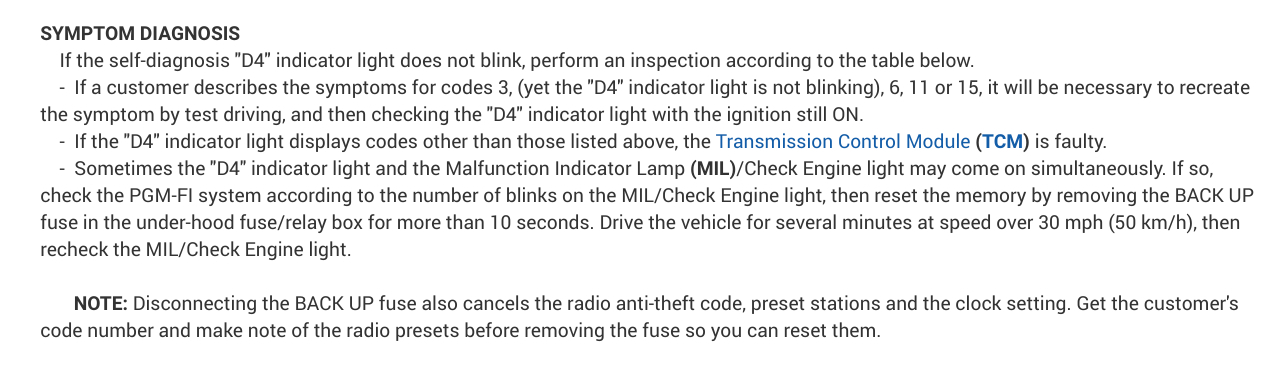 Okay, so to clarify this is an On Board Data 1[OBD1] system and not an OBD2 system. OBD2 is the standard today and every vehicle sold in the United States was required to have the OBD2 system on it from 1996 until now. The OBD2 system made all of the DTC's standard and greatly improved everything. So with this in mind, and I love Honda's, I actually went to college and took the Honda PACT[Professional Automotive Career Training] courses, so Honda trained me, Honda has 2 different sets of DTC's for their blink codes, one for the engine and one for the transmission. I think we are going to be working with the transmission guides here, but I have included all of them for you in the diagrams down below. Please go through these and get back to us with what you find out.