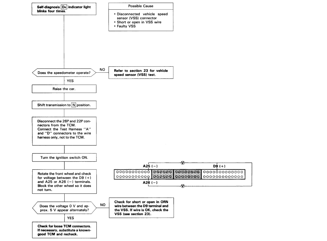 I got the D4 flashing code 4 before, which is VSS problem. I went through the troubleshooting procedure you gave me but didn’t find anything wrong with the sensor. Your recommendation earlier was to replace a new TCM. I later got the Check Engine Code 17 which was similar to the D4 code 4. Since this was an intermittent problem, I decided to replace the vehicle speed sensor first because it’s cheaper than replacing the TCM. My car has been running for a week without any problem since then.