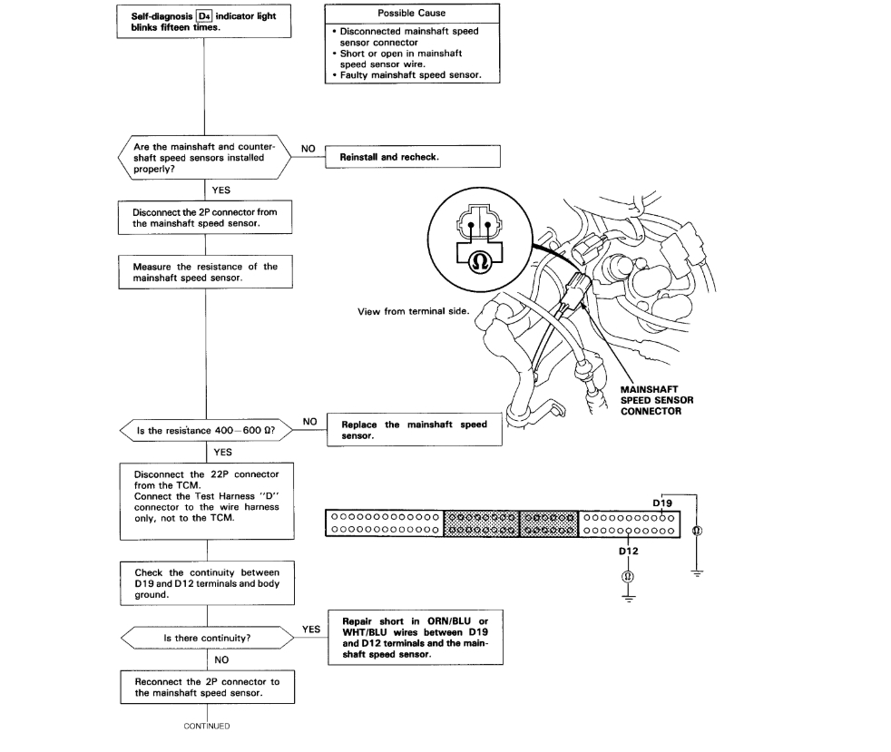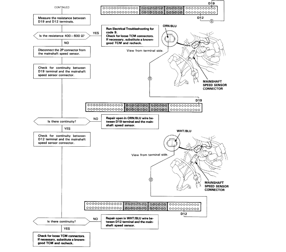 On the Transmission DTC code 15 troubleshooting, I reached the step that reconnecting the Mainshaft Speed Sensor and measure the resistance between D19 and D12. The resistance was 400-600 Ohm, and the conclusion was to run Electrical Troubleshooting for code 9; Check for loose TCM connector or substitute a good TCM and recheck.