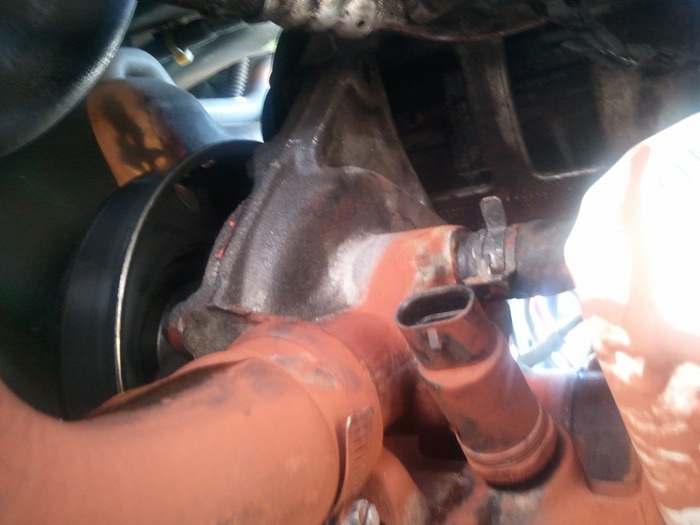 While investigating a leak on a friend's 1994 Town and Country 3.8 Liter V6 engine, I discovered that the fitting where the bypass hose connects to the water distribution bracket was completely snapped off. Thinking that it was the water pump, off I went to the parts store to buy a new one. The pump, however, had no hose fittings whatsoever. All of the fittings seem to be part of the same bracket where the water pump and a/c compressor mount. I'm guessing that the bracket serves the dual purpose of water router and mount to save space. I've attached two pics. One is from the underside of the car, showing where the radiator and another unidentified hose connects into the bracket. The other is the top view where there is supposed to be a fitting for the bypass hose (I can only guess that this is a heater bypass, the hose is approx 1" in diameter).