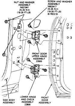 If removing the rear door (Explorer), remove the scuff plate and center panel trim panel. Remove the upper and lower hinge access cover plate if equipped, and matchmark the hinge-to-body and hinge-to-door location. Support the door either on jackstands or have somebody hold it for you.