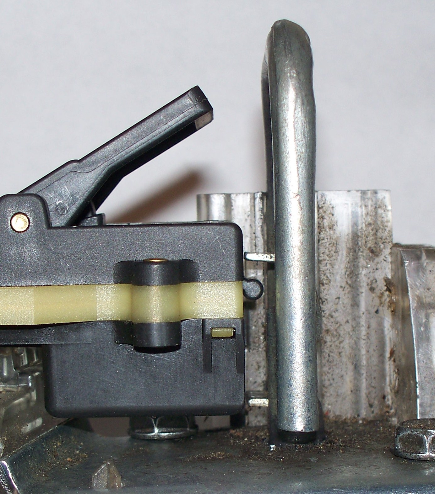 The switch is down as far as it will go. It clicks when the metal pushes it. If I run the striker back up (either by connecting it to the vehicle or by applying external power to the motor connections) the switch stays in the down position until the bottom metal contact flips it up, then it goes all the way up. The switch on the deck lid is securely attached to its connection. Pushing the switch on the deck lid accomplishes nothing, which is the whole problem. I ran an ohm test on the wires from the deck lid switch connection to the motor connection, and they all have good connectivity (i.e., zero resistance from the orange to the orange, red to red and black to black), so there are no broken wires in that circuit. I have ordered a new deck lid switch from Cadillac. Below are pictures showing that the metal tangs do contact and move the switch--when I make the striker move by manually supplying power to the motor.