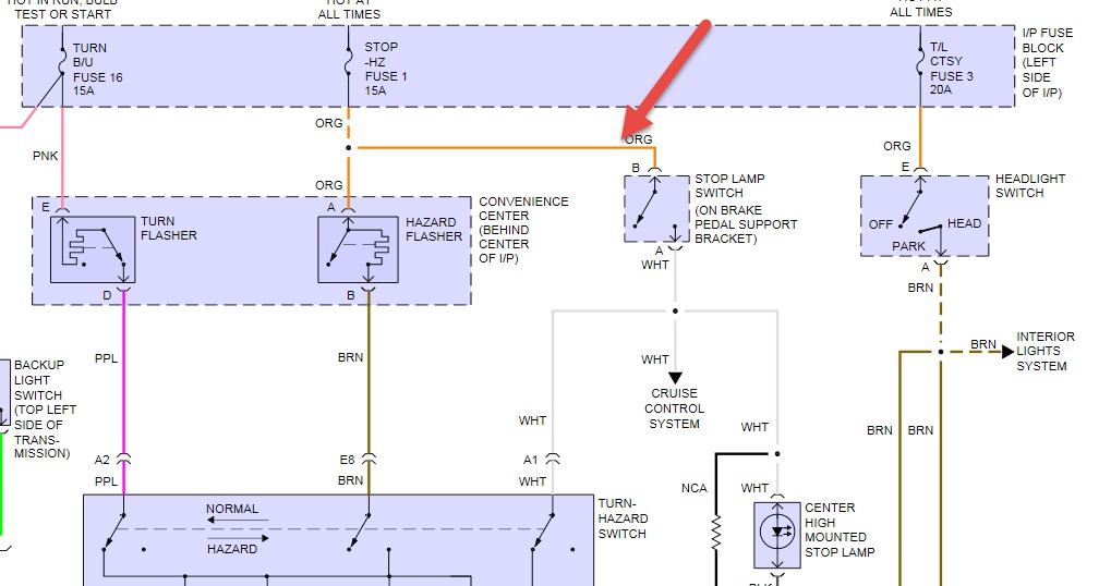 arrow points to hot wire leading form fuse box which is orange white wire leads to t/s switch and cruise control if you have it.