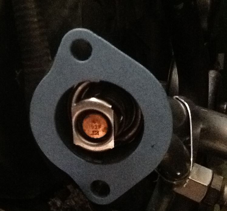 The first picture shows the thermostat placed on top of the housing gasket, and the second picture shows the thermostat placed under the housing gasket. Which is the correct one? The third picture shows the housing, but I don't see any places for the tabs of the thermostat to fit in to.