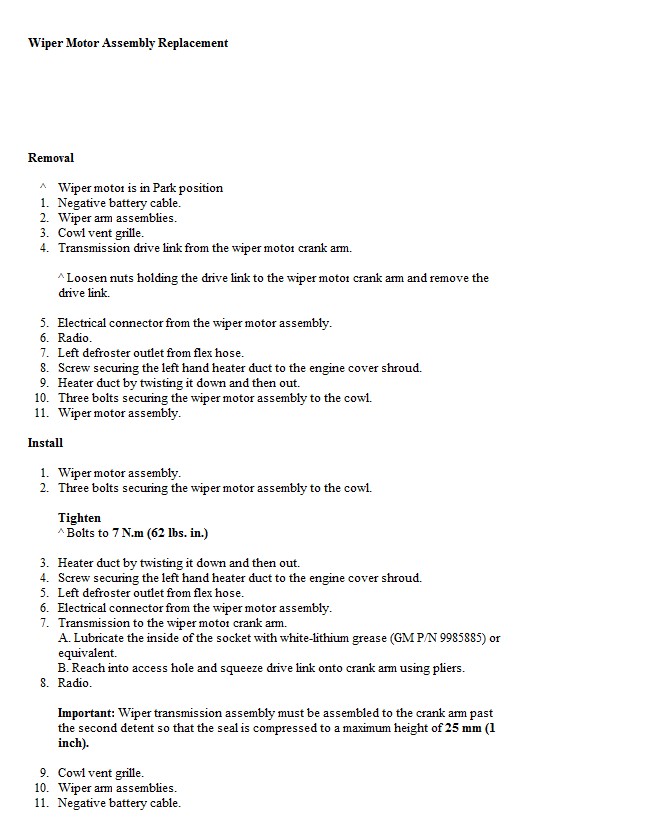 Important: Wiper transmission assembly must be assembled to the crank arm past the second detent so that the seal is compressed to a maximum height of 25 mm (1 inch).