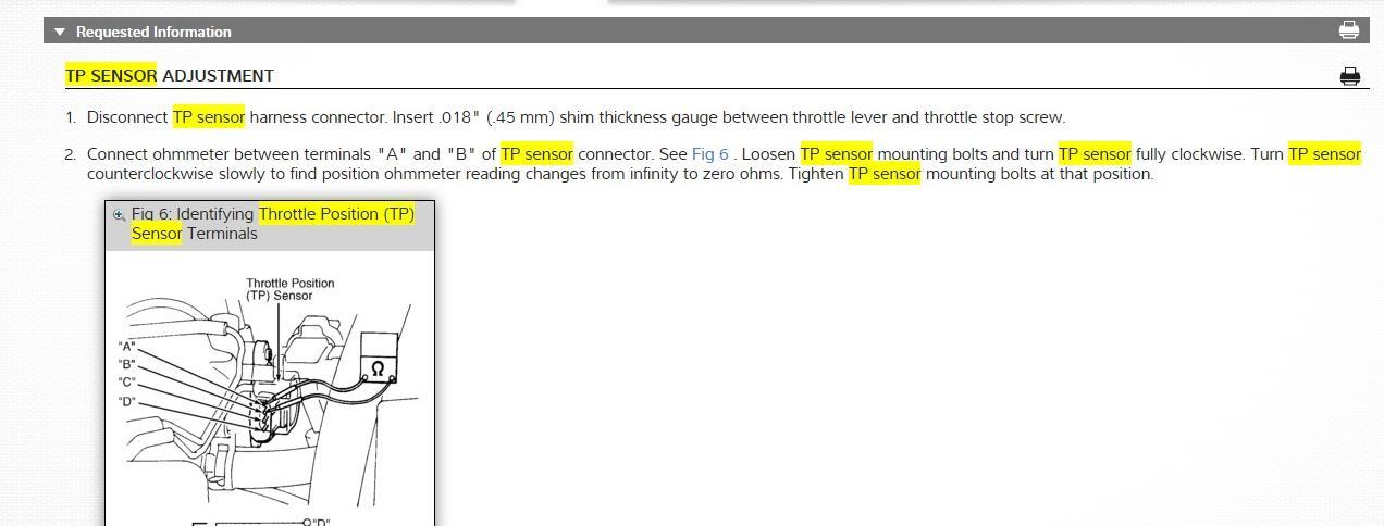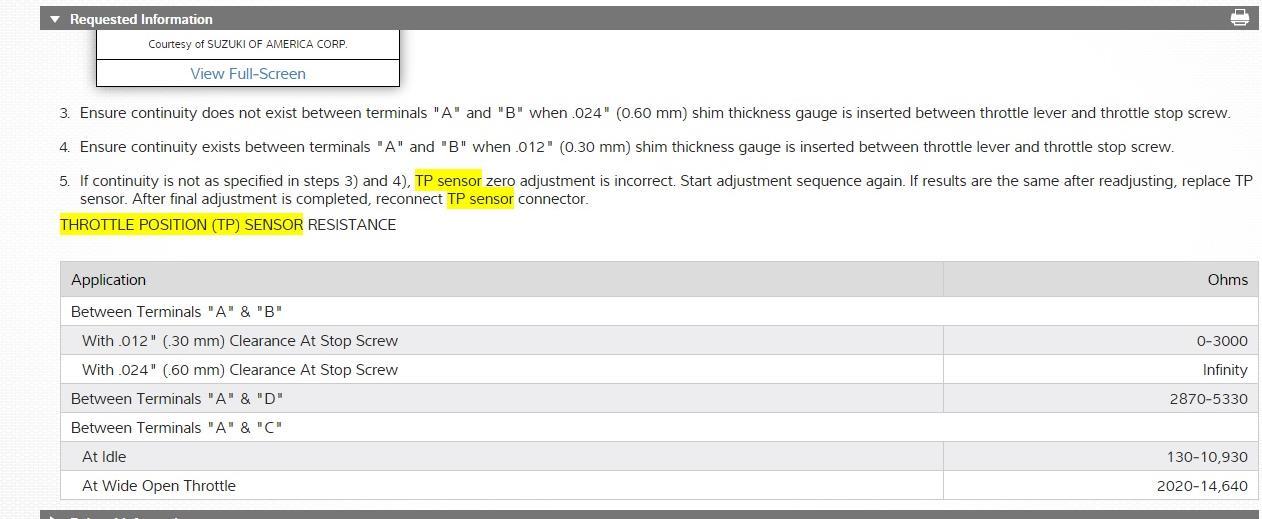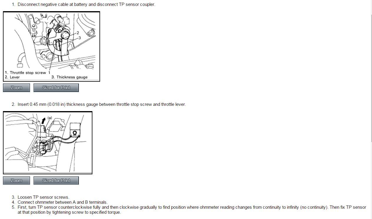 In the manual it says to insert 0.45 mm (0.018 in) thickness gauge between throttle stop screw and throttle lever and turn TP sensor counterclockwise fully and then clockwise gradually to find position where ohmmeter reading changes